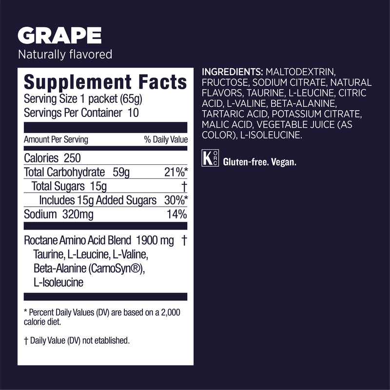Each serving provides carbohydrates (maltodextrin and fructose) that use non-competing pathways for energy that kicks in fast and stays with you longer; sodium, the primary electrolyte lost in sweat; BCAAs (L-Leucine, L-Valine, and L-Isoleucine) which may reduce mental fatigue and decrease muscle damage; taurine, which can help maintain heart contractility and improve cardiac output during long exercise sessions†; and beta-alanine, which can help delay the onset of fatigue during high-intensity efforts.†