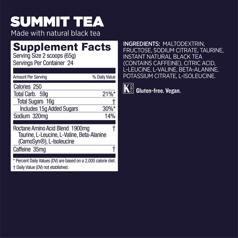Each serving provides carbohydrates (maltodextrin and fructose) that use non-competing pathways for energy that kicks in fast and stays with you longer; sodium, the primary electrolyte lost in sweat; BCAAs (L-Leucine, L-Valine, and L-Isoleucine) which may reduce mental fatigue and decrease muscle damage; taurine, which can help maintain heart contractility and improve cardiac output during long exercise sessions†; and beta-alanine, which can help delay the onset of fatigue during high-intensity efforts.†