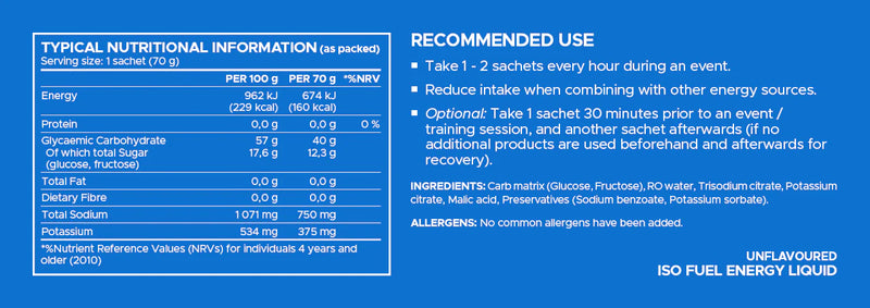Convenient on-the-go liquid cramp block isotonic gel that replenishes electrolytes and provides energy. This easy-digestible gel will boost energy and sustain endurance performance for longer by making use of a tri-carb matrix for variable energy release times.