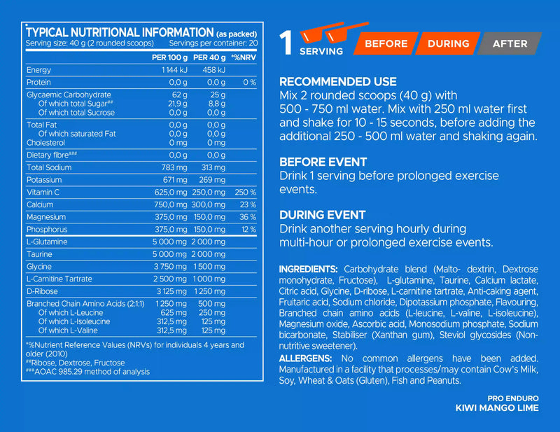 Pro Enduro is a high-performance endurance drink that is stimulant free. It has no caffeine and is high in amino acids (10 g/serving) for optimal performance and recovery during activity of up to 4 hours. It provides sustained energy release for optimal performance & hydration.