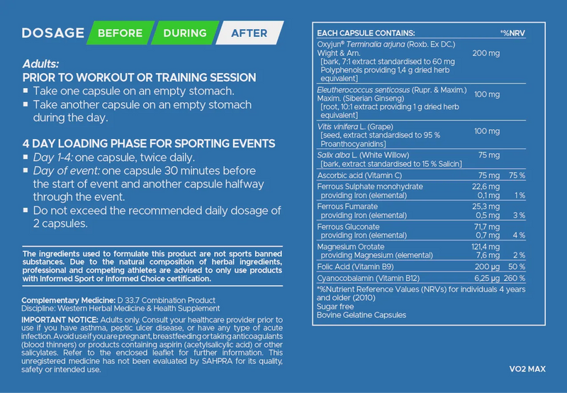 Increase oxygen uptake and storage and assists muscles to work harder for longer. Assists cardiovascular function and absorption of oxygen. Also increases the ability to store and utilise oxygen. Protects the cardiovascular system during intense activity.
